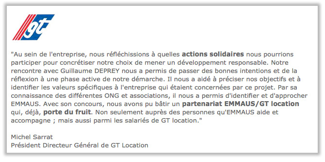 4) Le bénévolat de compétences : (Exemple) GT propose à aux salariés qui le souhaitent de s'impliquer en tant que bénévoles auprès d'Emmaüs dans différentes régions de France.