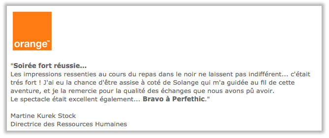 Organiser un dîner dans le noir pour permettre aux salariés d’Orange de se mettre réellement à la place d’une personne malvoyante. Les salariés sont « guidés » pendant le repas par des personnes aveugles. Le diner est suivi d’une comédie musicale qui permet d’apprendre à faire de son handicap une force.